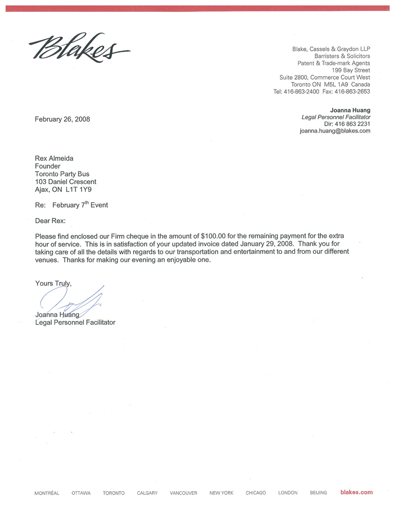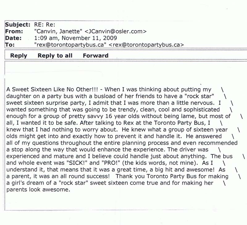TESTIMONIALS From Joanna: From Janette: From Frank: Thank you once again for your services on Saturday May 12 for my sister's birthday party! We had a great time and my sister liked the decorations on the bus and we will definitely recommend your services to our friends. From Jenny: Hi Rex. I just wanted to say thank you for all your help on Friday. The Bride had a wonderful surprise that she still can not get over the bus. I have never had so much fun on a bus and I will be calling you again for my little sisters stagette in a few month. Thanks again, Jenny From Lisa: Hey Sexy. you really got these girls wild last night. Your bus is awsoooom and the girls loved the Karaoke on the bus. I will recommend your company to my friends and definitely calling you back again. Chow To Rex: I just wanted to say thanks for a good time on Saturday July 21. we all loved the Karaoke and disco lights on the bus.now we want to know who is getting married next so we can be on the bus again. Thanks Stacie Hi, Rex I just wanted to say Thank you for a wonderful night out on Friday. we all enjoyed ourselves on the bus and everything ran very smoothly. Thanks for getting us the VIP line by-pass and the no cover and also getting us home safe at the end of the night. you are well organized and I liked that. so thanks again from all the boys at Jim's stag.From Christine: Just wanted to say thanks to you,Rex, you were great the whole night.... everyone had a good time .I wish you could have joined us at Cantina Charlie's. I can not wait to have another party on your bus. From Lina: I just wanted to thank you so much for an amazing time on Saturday August 2 2007! Everyone loved the bus and we all definitely be calling you again for all our stagettes and 'gatherings'!! I really appreciate how accommodating you were with our last minute booking, torontopartybus was definitely the best idea that we've seen and you will be highly recommended!! I wish to also thank you for your patience with us during our visit with the fireman and police officers and also getting us the VIP line bypass and the no cover charge. you were very organized with the schedule for the evening and everything went perfect! you definitely made our night a great one to remember!! Thank you so much for everything and we'll be in touch with you. From Heather: Hi Rex. Thanks for all your help on Thursday for the summer party. your buses looked great and everyone seemed to have enjoyed the ride from the firm to the docks. Thanks for shuttle service your guys provided that was a big help. Please keep December 14 open as I will be calling you again for our Christmas party event. From Tracy: We just wanted to say Thank you for all your help this past weekend for Amanda's stagette. Everyone had a wonderful time!!!!. you did a great job, and all the girls in the wedding party, just wanted to say Thanks again! that was a great night out and a big help to me. From Steve: Yeah, everything was great...the guys had a blast and the club bookings worked out perfectly. (Bier market was a def.fave- I couldn't get the group to leave!) Plus I overheard one of the guys say "this bus is kickass" (which is the highest satg compliment) Thanks again......everybody enjoyed it. Hi Rex: We all had a really great time. The bus was a fabulous way to get around the city and we'll be sure to spread the word to friends who may be looking for something similar. Can't wait to see the pics! Adrienne Hi Rex: This is Diana. Just wanted to say Thank you so much for providing a great service. Peggy was very pleased with how everything turned out on Friday. I will highly recommending your service to my clients and hopefully do some weddings next year with you. I will keep in touch I just wanted to say how impressed Richard and I were by your bus (with the decorations provided), your professionalism (managing a bus of teenagers) and your responsibility (for their safety and well being). The partygoers loved the bus. I would recommend you to any parent wanting to do something special for their teenager, and to anyone who requires fabulous transportation for special occasions. Penny Hi Rex, Sorry it has taken me so long to get back you. It was quit busy over the holiday's this year! I just wanted to let you know that we had a great time at the Bill's football game on Dec 20th 2009. I would like to thank you for the bus that was provided and the professional, competent driver "Max". Right from the start we all felt very comfortable with his driving skills and he had an excellent personality. Actually one of the passengers on the bus, who is a retired school bus driver commented on how good of a driver he was. I have used other bus companies for the Bill's game trip, but this was the best by far! I look forward to using your company again in the future and will definitely be requesting "Max" as the driver. Once again thanks, and if it wasn't for Toronto Party Bus and the driver "Max" the day would not have turned out as great as it did!! Thanks Jeff From Steven May 08 2010. Hey Rex, Thank you for your help hosting our party last night with the bus. The group had an excellent time. we definitly hope to come back soon, and you will here from me again. Thanks for your hospitality and I hope to potentially do business with you again. May 15 2010 Hi Rex. Thank you for all of your help with Amanda's Bachelorette and answering my many questions! We had a great time on the party bus and the club was amazing! Please give a special Thank You to our driver Peter - he was very good to us - we needed to make a pit stop on the way in and we lost a girl at the end of the night and he very graciously waited for us to find her. You provide a very good service and we all got home safely. Keep up the good work and I will definitely recommend you to all of my friends. Thanks again!. Leslie LangJune 24 2010 Hey Rex, Just wanted to send you an email to say thanks for all your help yesterday, and everything went rea